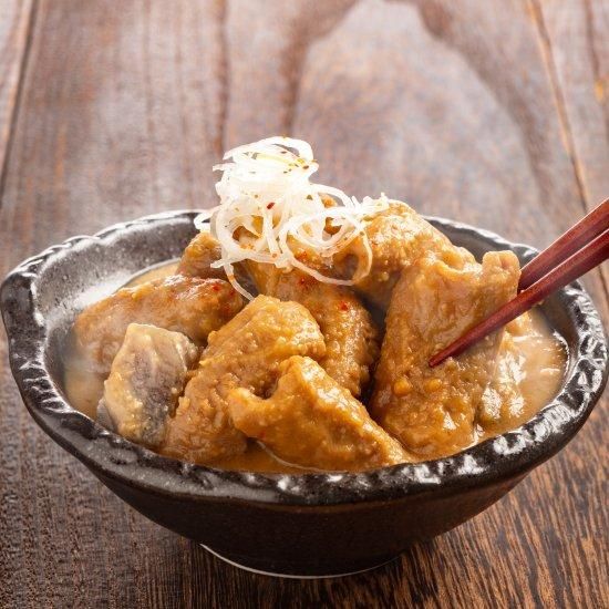 豚白もつ(国産)、こんにゃく、味噌、豚脂、にんにく、たまねぎ、みりん、ごま、香辛料